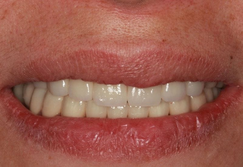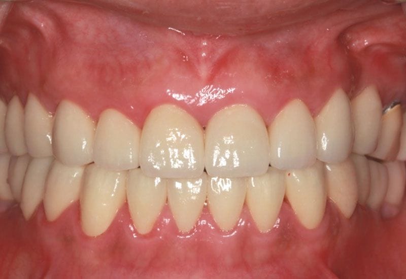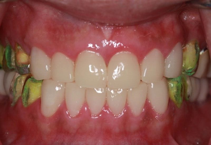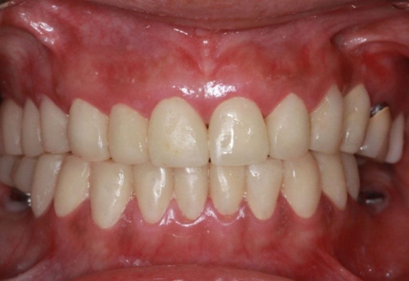 假牙完成後 病患恢復咬合功能,微笑曲線的建立與全瓷假牙的治療,讓病患有自信的笑容,牙齒也因為有了保護而減低敏感度,此後建議病患定期回診 並已製作咬合板 請病患於睡覺時配戴 防止夜間磨牙的高咬合力量造成假牙或牙齒的損害